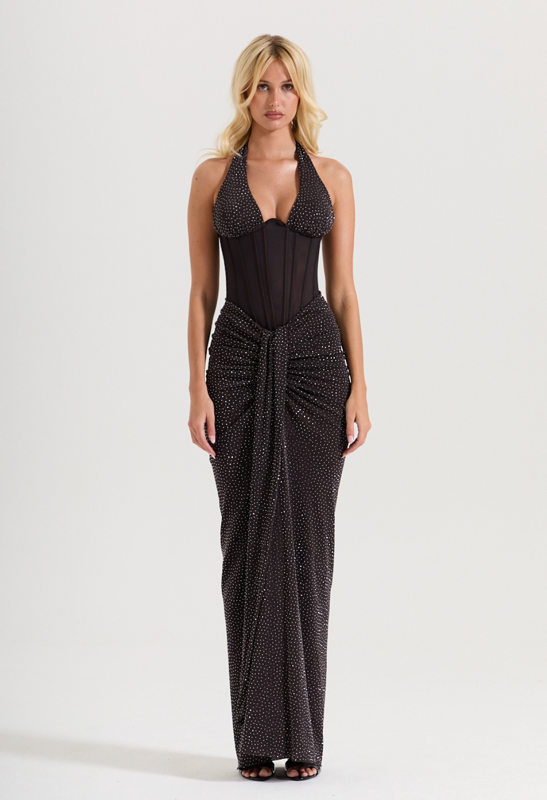 Make an unforgettable entrance in the Celine Sparkle Maxi Skirt in Deep Brown; our best-selling silhouette reimagined with added sparkle and new statement ties for extra festive drama. Designed to sculpt, flatter, and elongate, Celine is crafted from our luxurious brown stretch sparkle fabric with a ruched, gathered front and dipped waistline that cinches and drapes effortlessly to the floor. Two front ties add movement, length, and elegance; the perfect finishing touch to this show-stopping design. Pair with the Celine Sparkle Bodysuit for a modest party look or with the Celine Sparkle mini for less coverage.