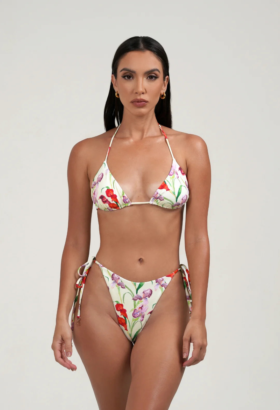 Our Capri top is your new go-to triangle with a Sydney Lane twist. This multiway style can be tied at the front for more of a statement or the back for a classic look. Our bespoke Sydney Lane gold and pearl charms adorn each tie for an added touch of luxury. Capri is double lined in our super soft buttery and recycled fabric for ultimate comfort and fit. Gathered cups can be adjusted and styled for more or less coverage as desired. Our Gardenia floral print is inspired by a summer meadow and hand painted with love.