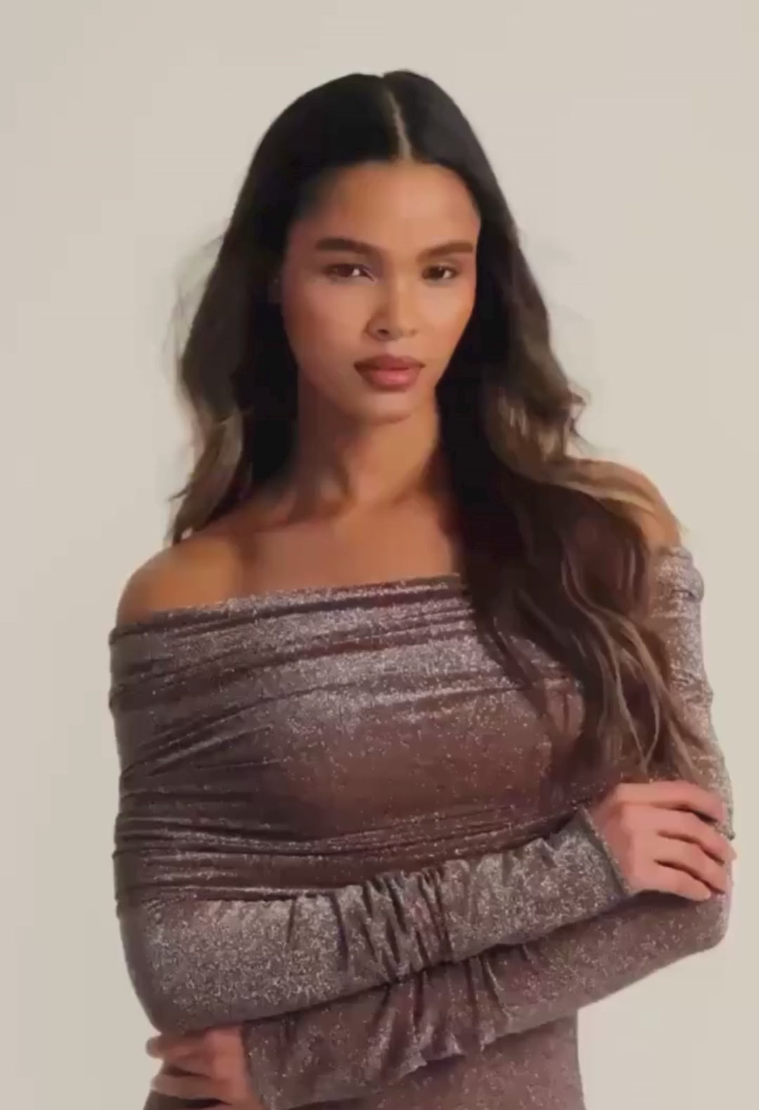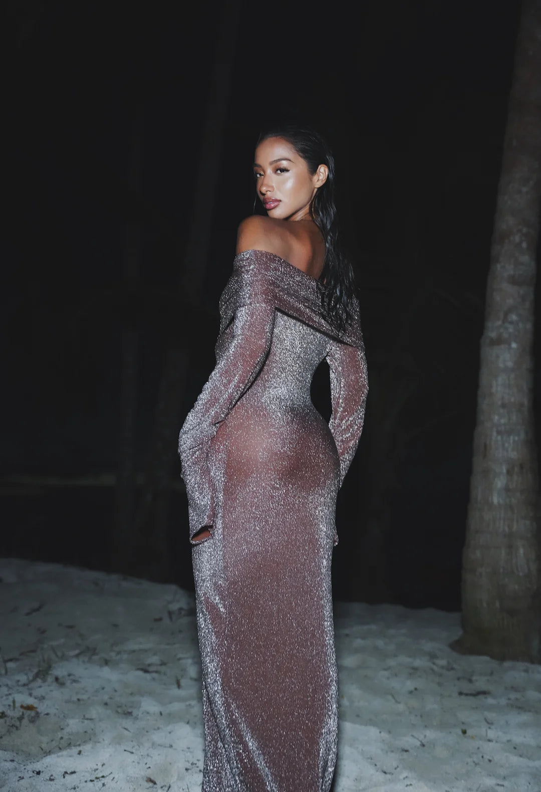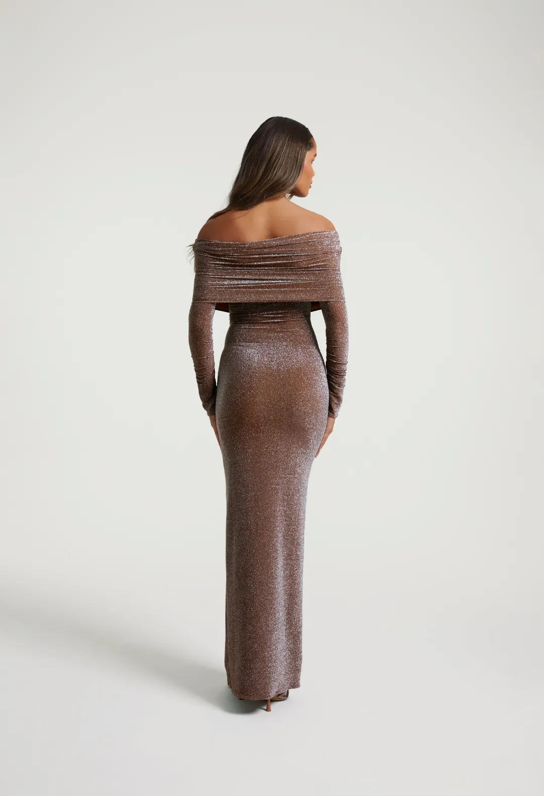 Step into the spotlight this season with our Elsa floor length strapless dress in Chocolate Brown.. Woven with the softest silver thread this luxury metallic fabric hugs your silhouette in all the right places and gives off a subtle shimmer whenever the light hits. Pair with your favourite strappy heels and a statement earring for an unforgettable look that will turn heads and leave a lasting impression this party season.