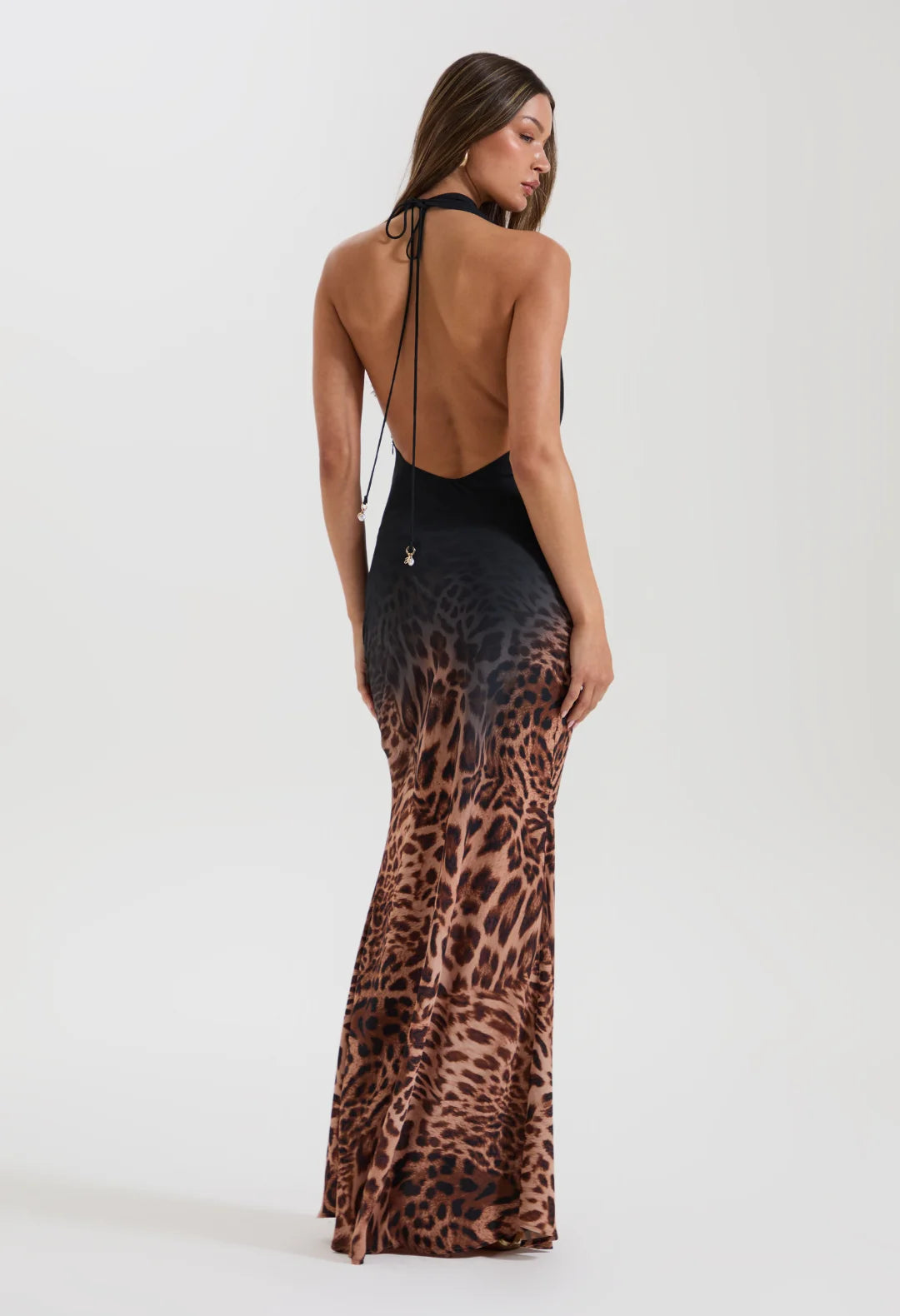 Make a daring statement in the Kelly Maxi Dress — a powerful blend of modern glamour and wild elegance. Inspired by the viral favourite from our AW collection, our leopard ombre print returns this season in a fresh summer silhouette. Featuring a plunging draped halter neckline, a sexy low back, and delicate charms for a subtle yet luxurious detail. Our signature leopard ombre print is thoughtfully placed to highlight your silhouette and give you confidence with every step.