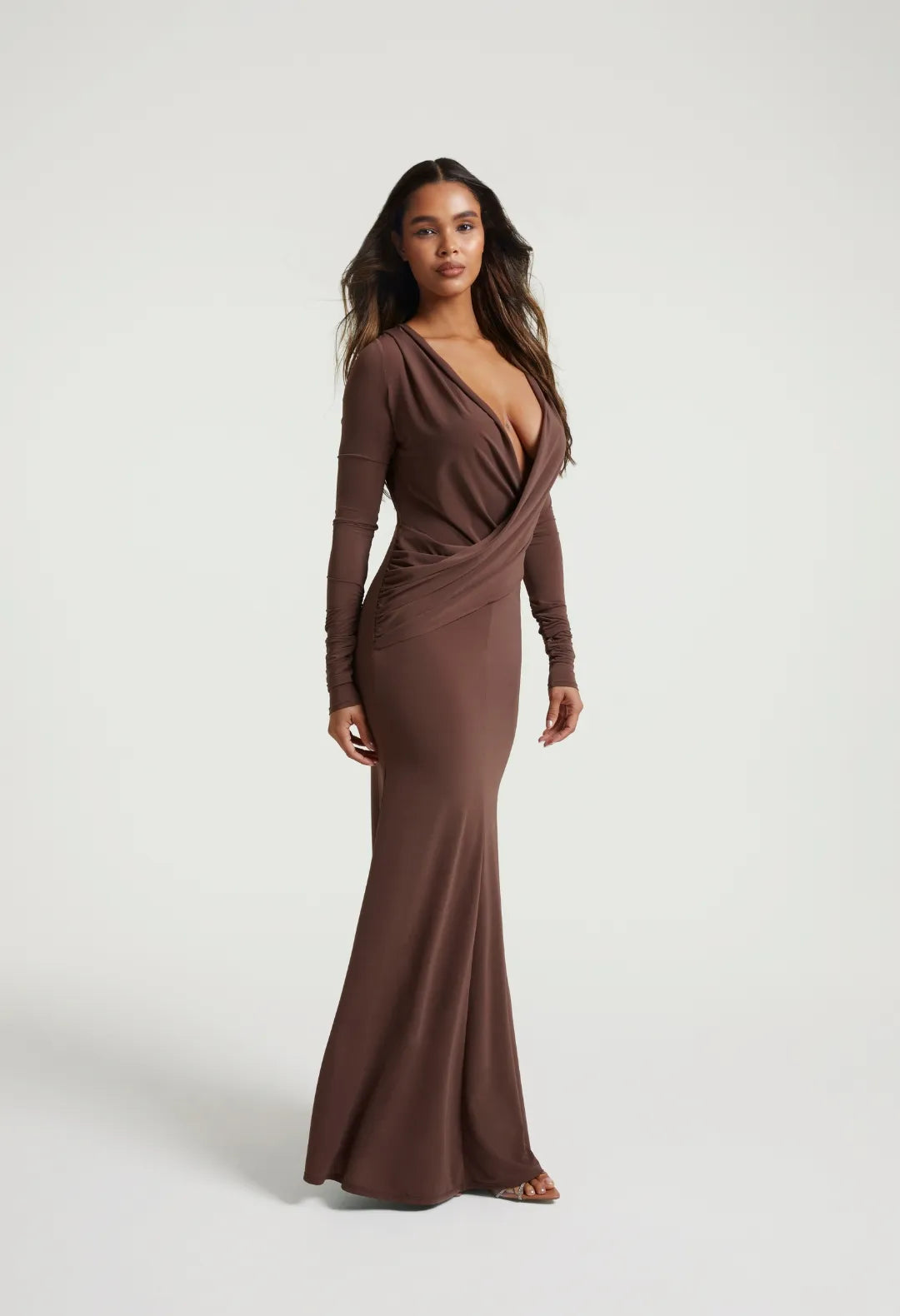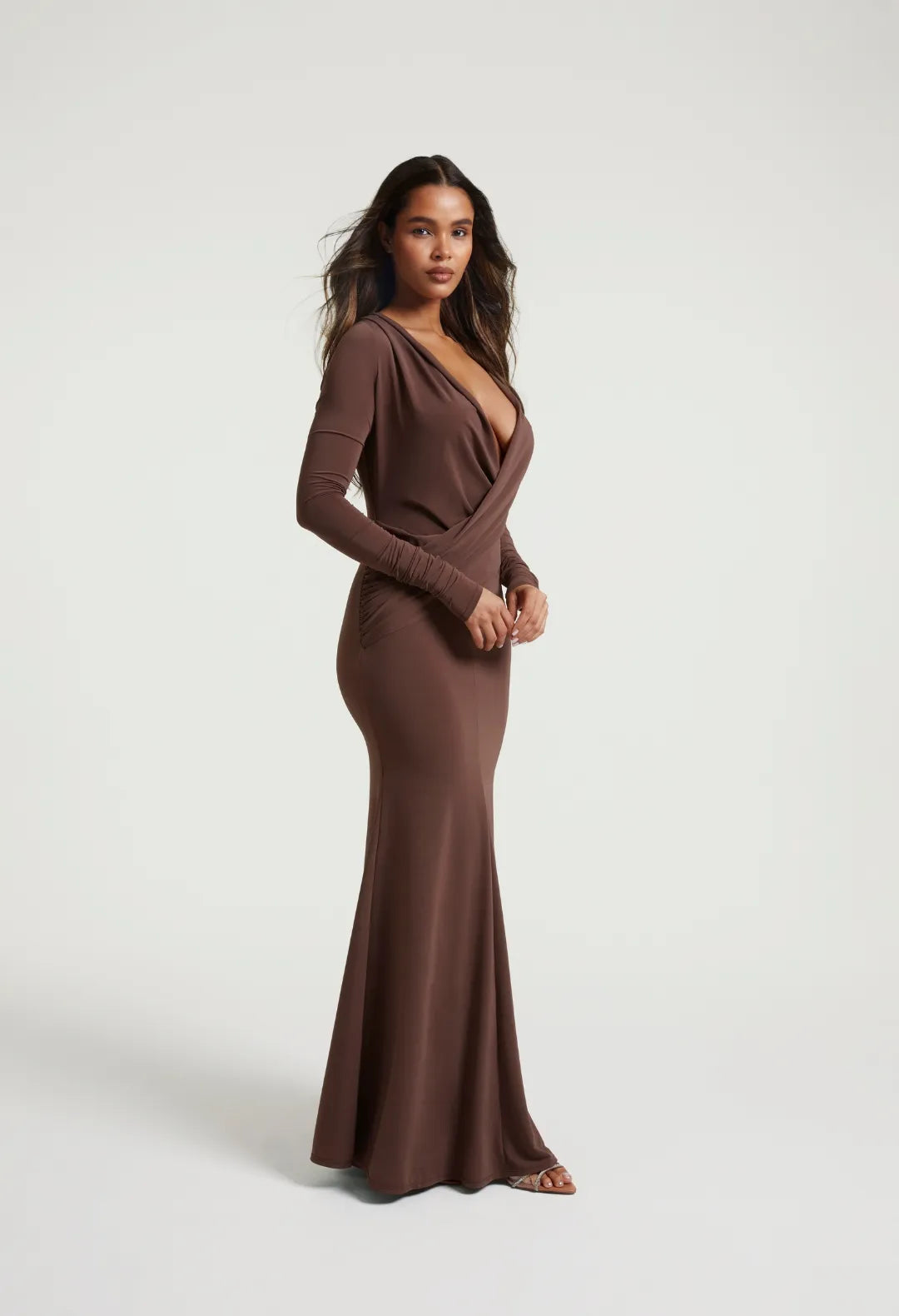 Prepare to make a statement this holiday season in our Stella draped maxi dress. This show-stopping, floor-length gown in a rich chocolate brown is designed to turn heads from every angle. Featuring a dramatic draped neckline, long sleeves with a subtle gather at the wrist and flattering fishtail silhouette, every detail has been thoughtfully crafted. Timeless, bold, and undeniably glamorous.