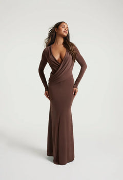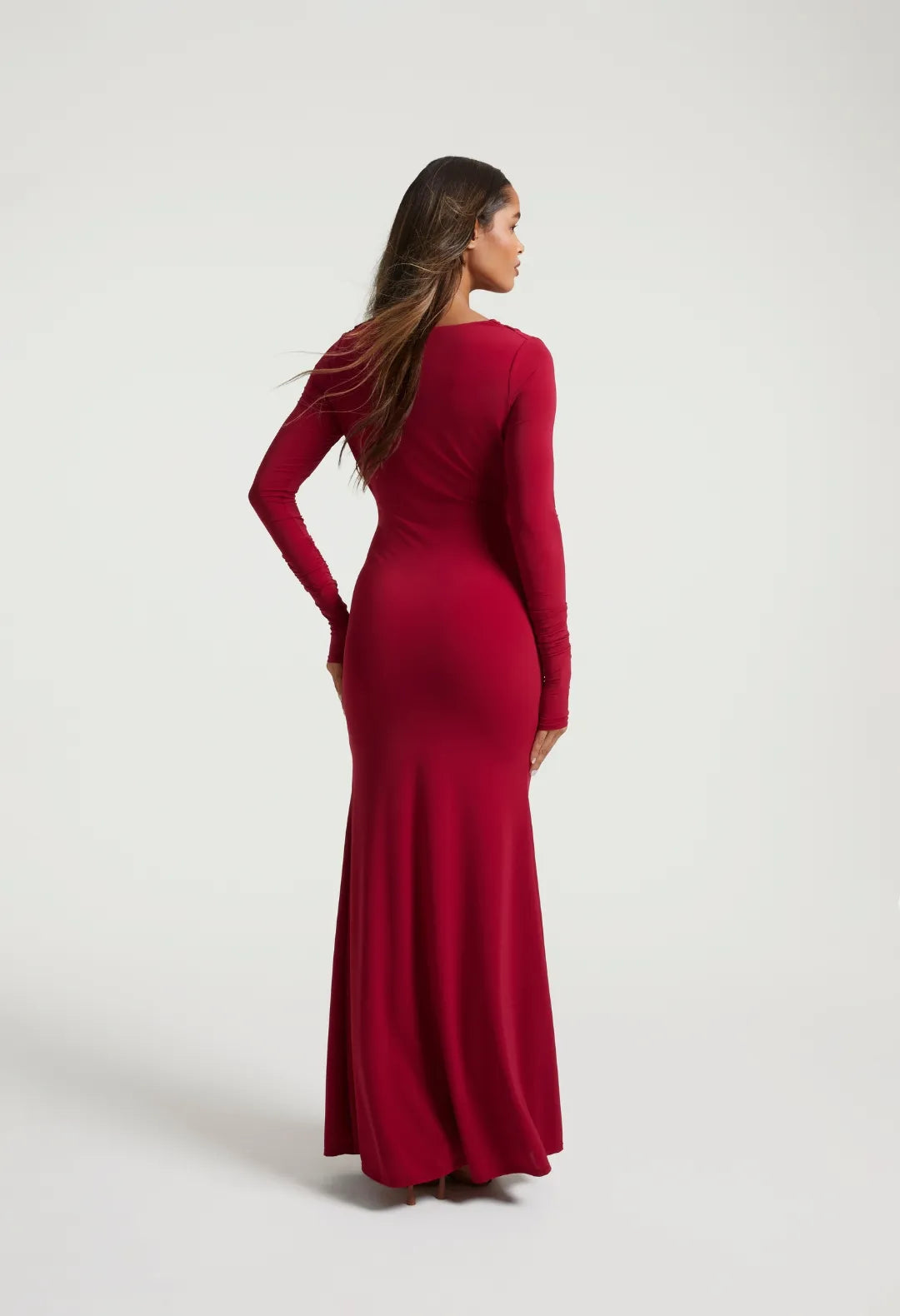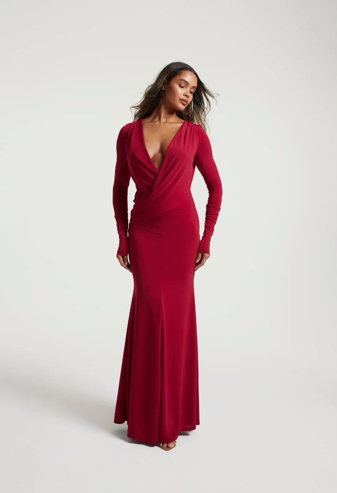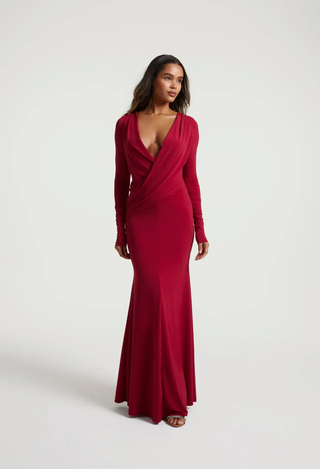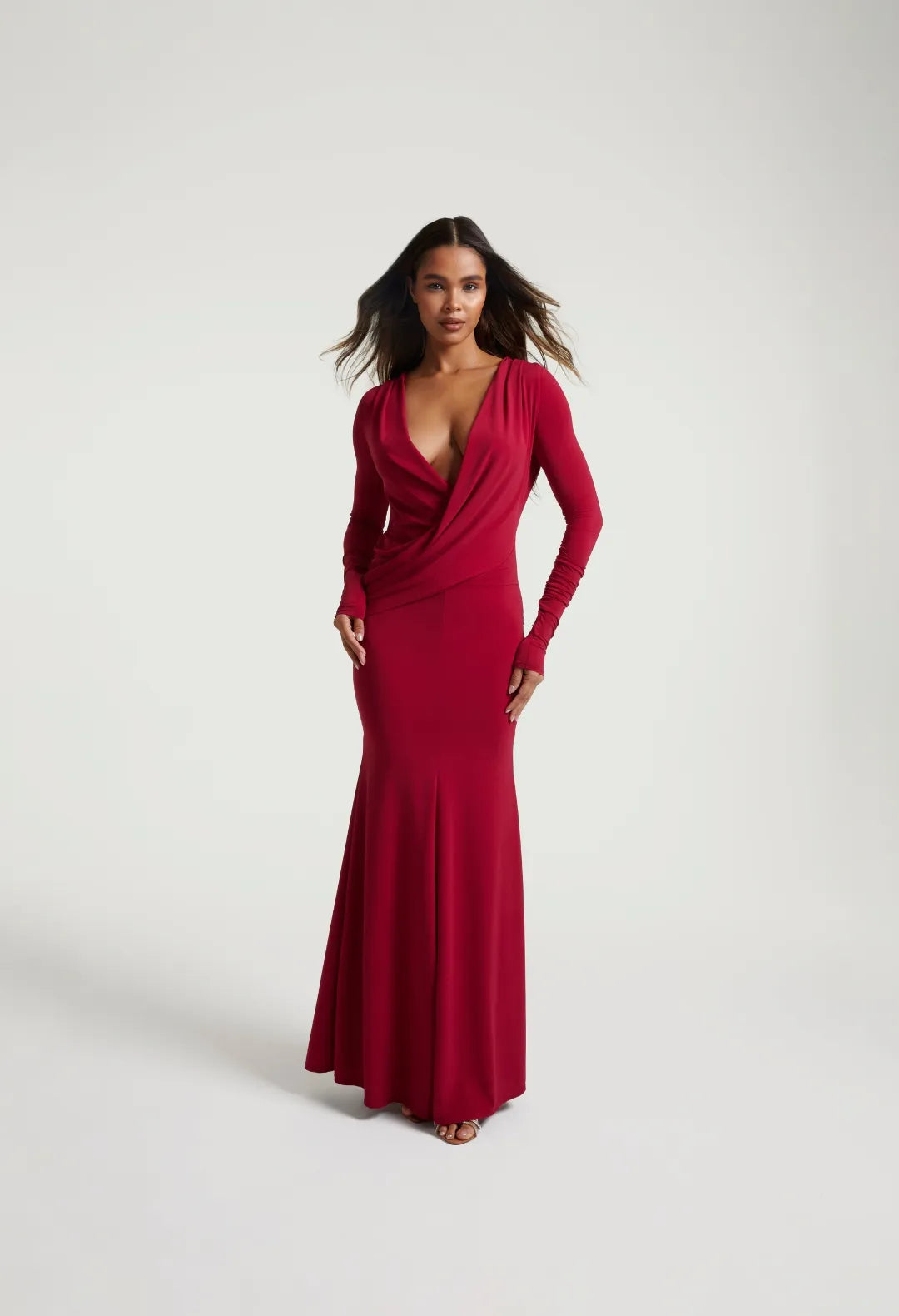 Prepare to make a statement this holiday season in our Stella draped maxi dress. This show-stopping, floor-length gown in a striking deep red is designed to turn heads from every angle. Featuring a dramatic draped neckline, long sleeves with a subtle gather at the wrist and flattering fishtail silhouette, every detail has been thoughtfully crafted. Timeless, bold, and undeniably glamorous.
