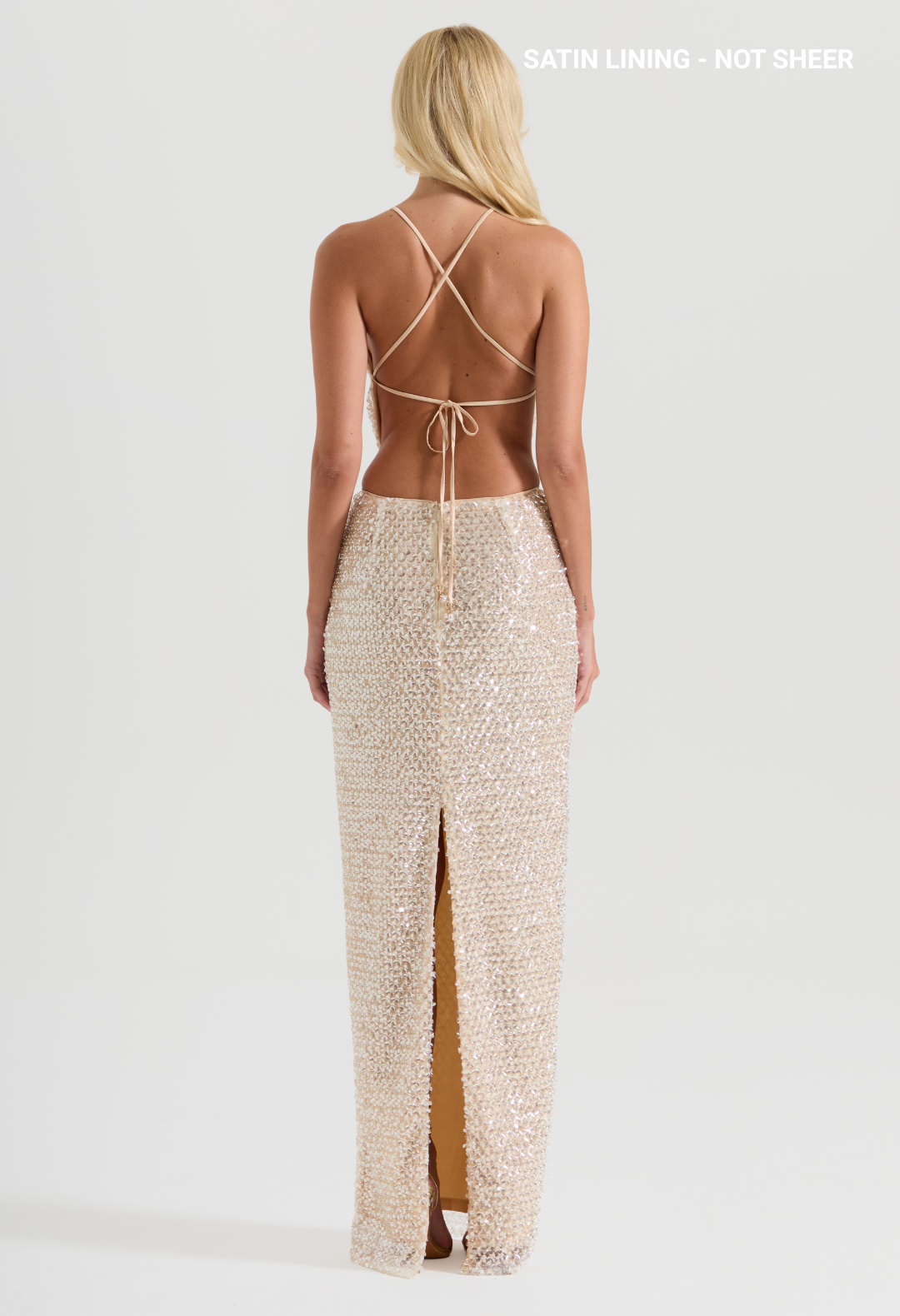 Crafted in our signature, one-of-a-kind embellished fabric, a mix of sequins and beads reflect every drop of light for the ultimate sparkle. Quartz Champagne is available in two different linings, select satin lined for extra coverage or mesh lined for a lighter semi sheer effect. This maxi skirt can be styled low on the hips or higher on the waist, depending on your mood. A discreet centre back zip and knee high split ensures maximum comfort when worn . Quartz is the ultimate party-ready statement for those who want to own the spotlight.