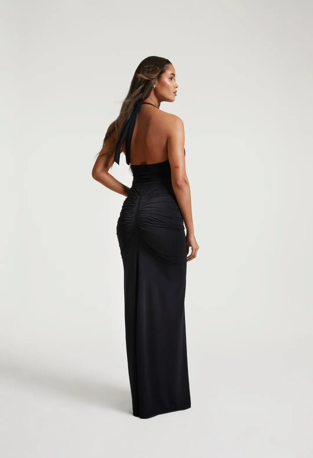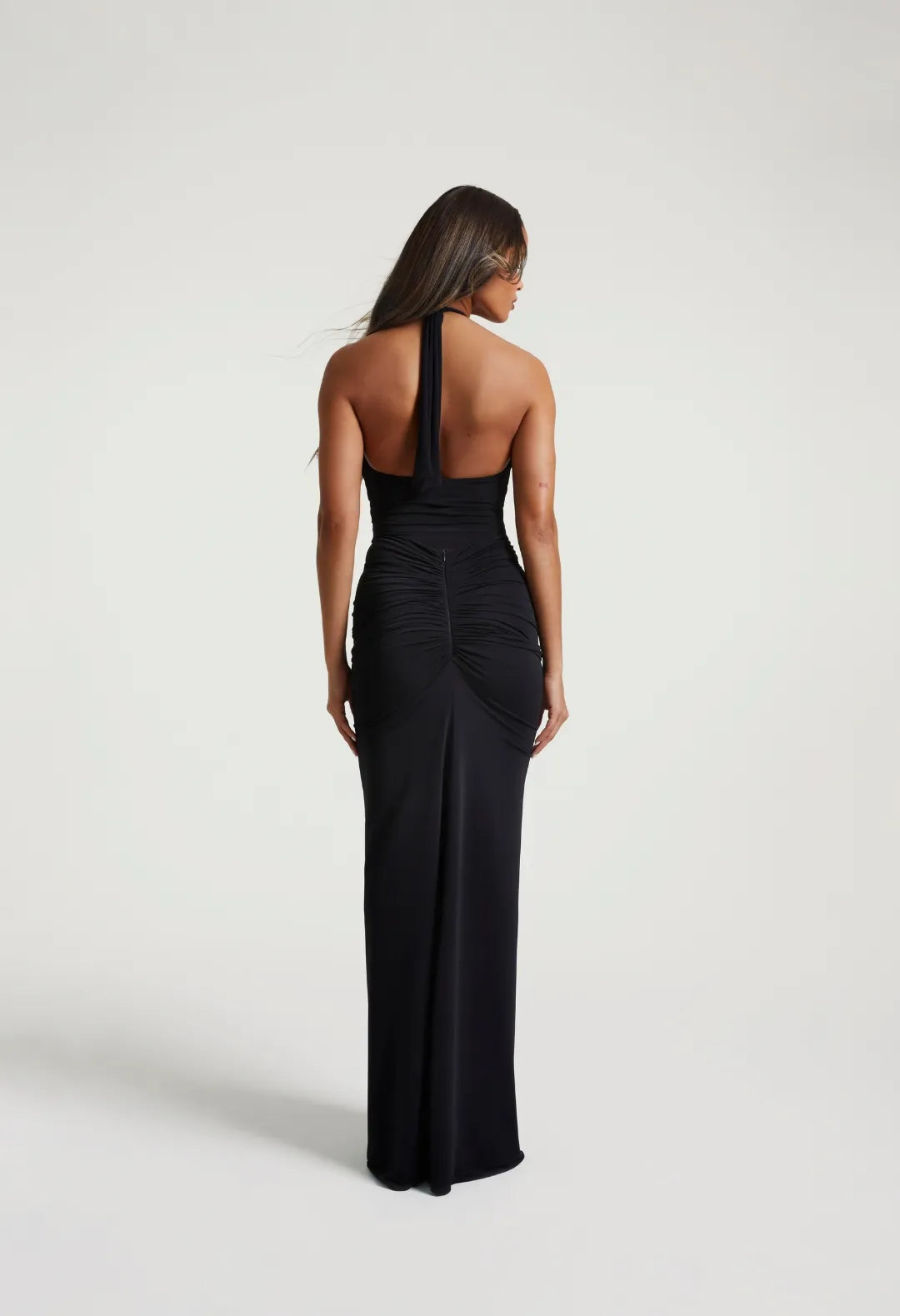 Meet Angelina: your classic LBD, redefined. Crafted with comfort and your curves in mind, this luxury two-piece set is made up of a stretch halterneck bodysuit and gathered maxi skirt to ensure you turn heads this holiday season. The skirt, with its flattering dropped waist and center-back zip, moulds effortlessly to every silhouette. Meanwhile the bodysuit’s expertly crafted panels contour and support, enhancing your natural shape and providing just the right lift.