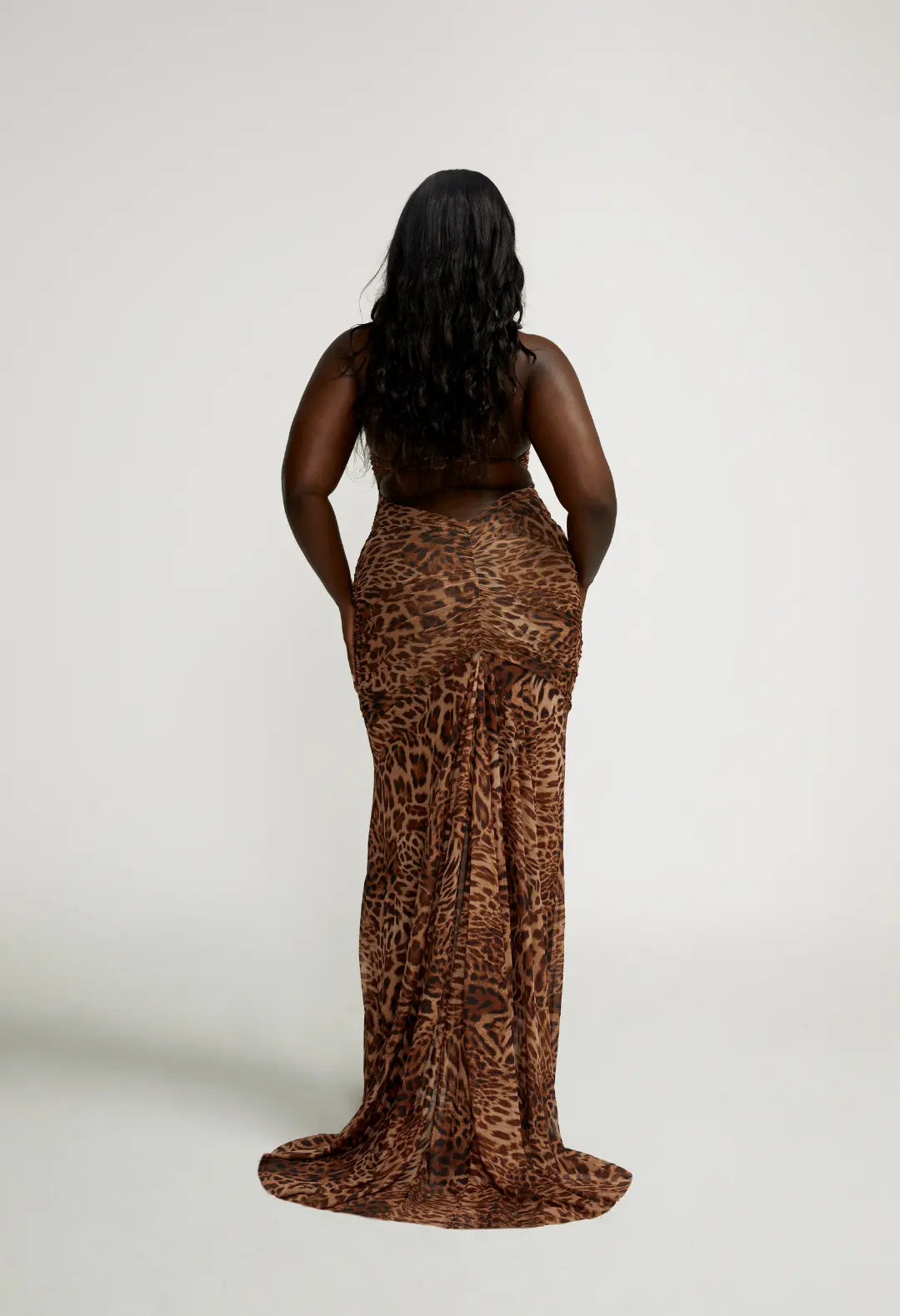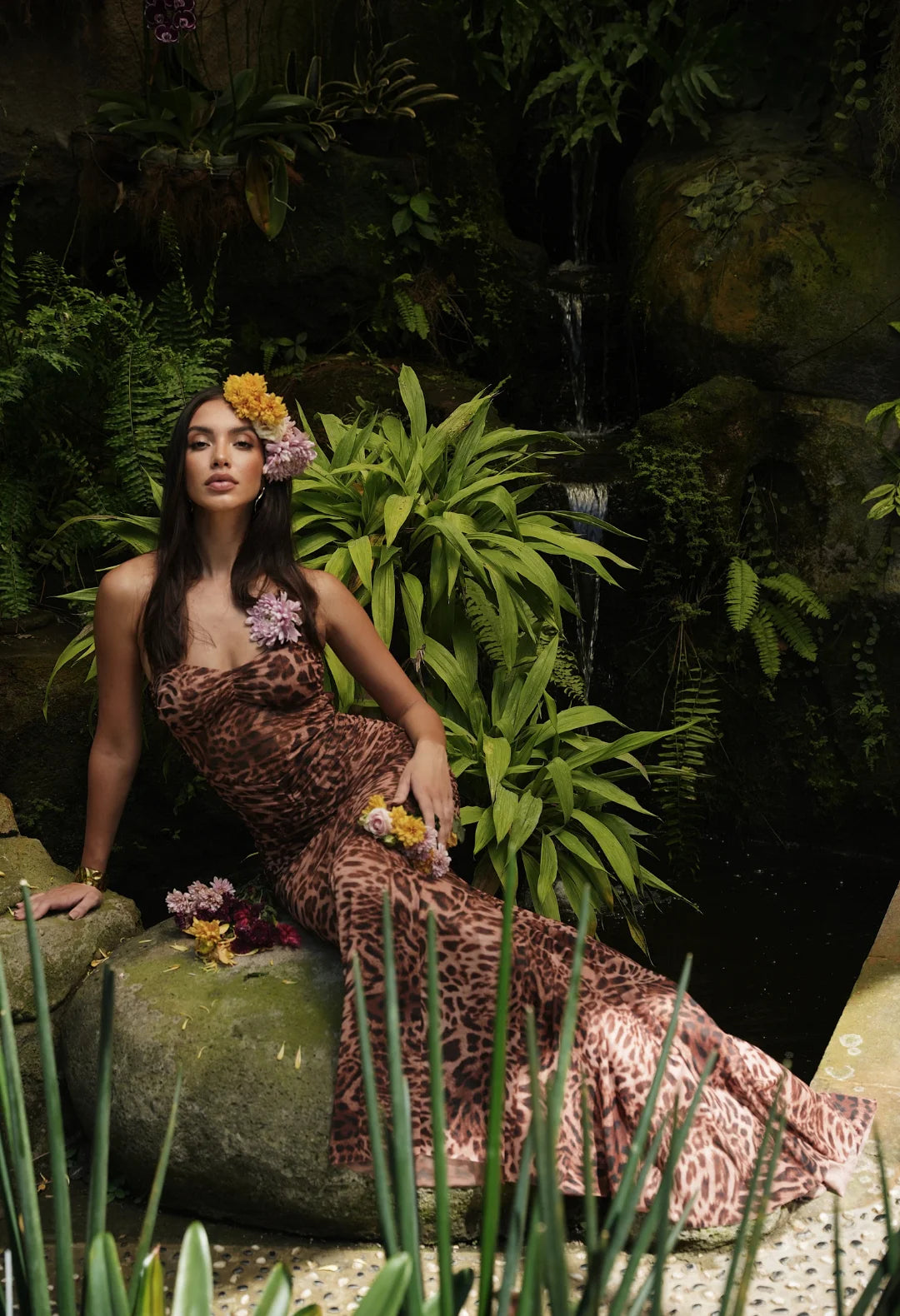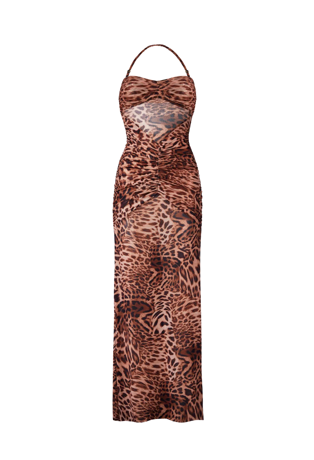 Introducing our viral Bronte Mesh Dress in leopard print, the ultimate statement piece of the season. This dress features gathered mesh panels that are designed to beautifully flatter curves and show off your silhouette. With removable padding and halterneck straps, you can enjoy added support and coverage when desired. A dramatic statement train has been designed to create the most breathtaking movement when walking, making everyone stop and look twice.