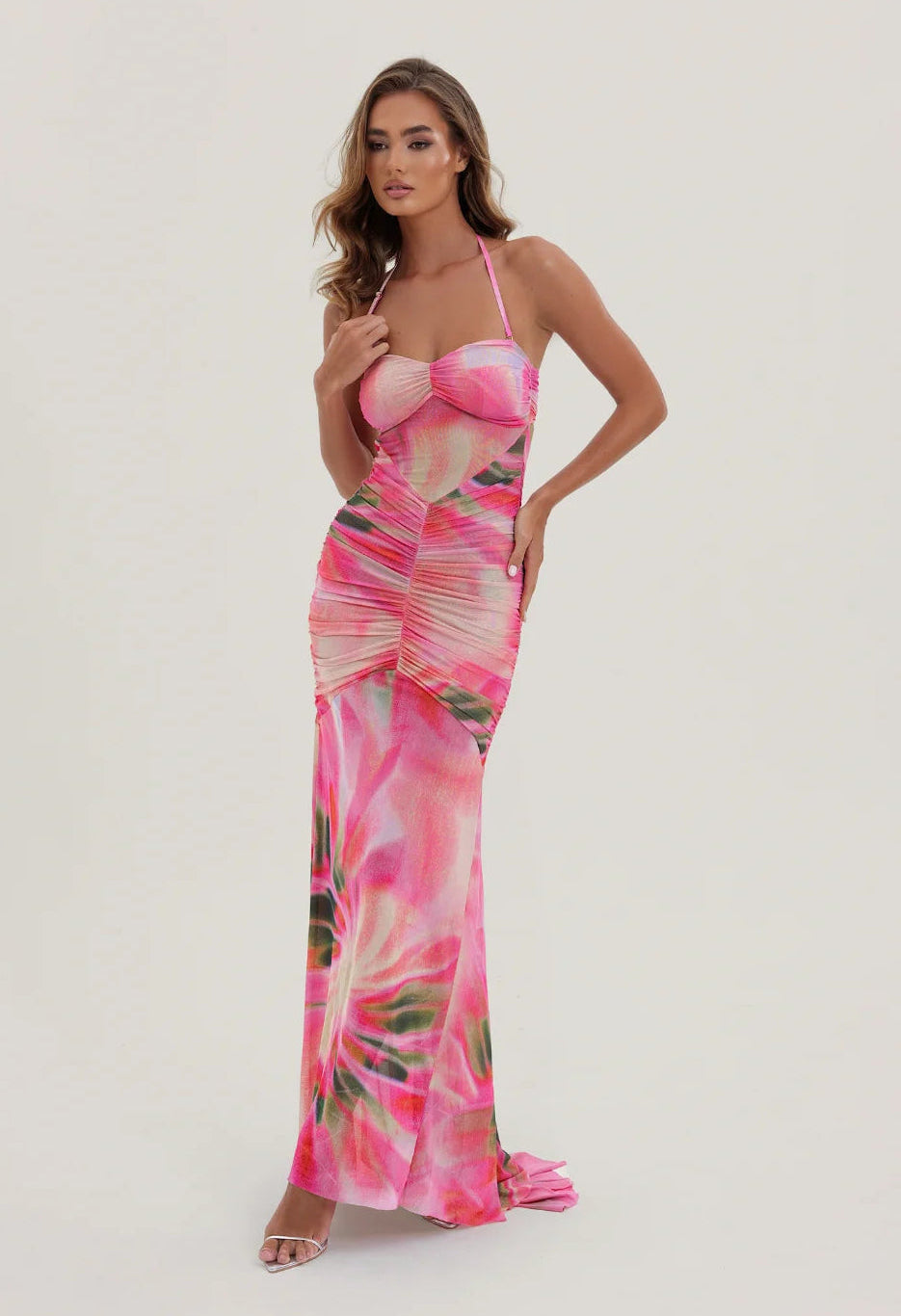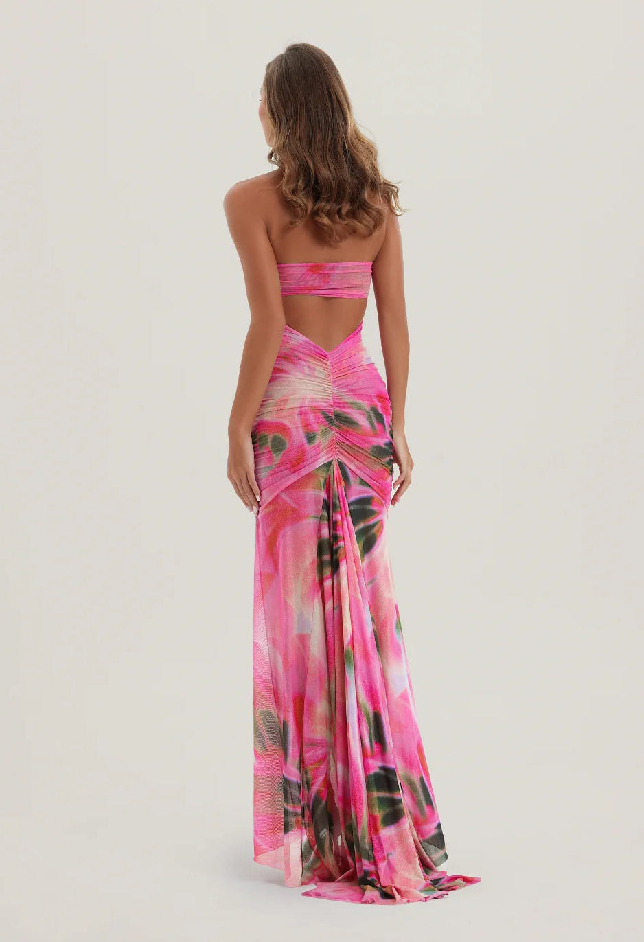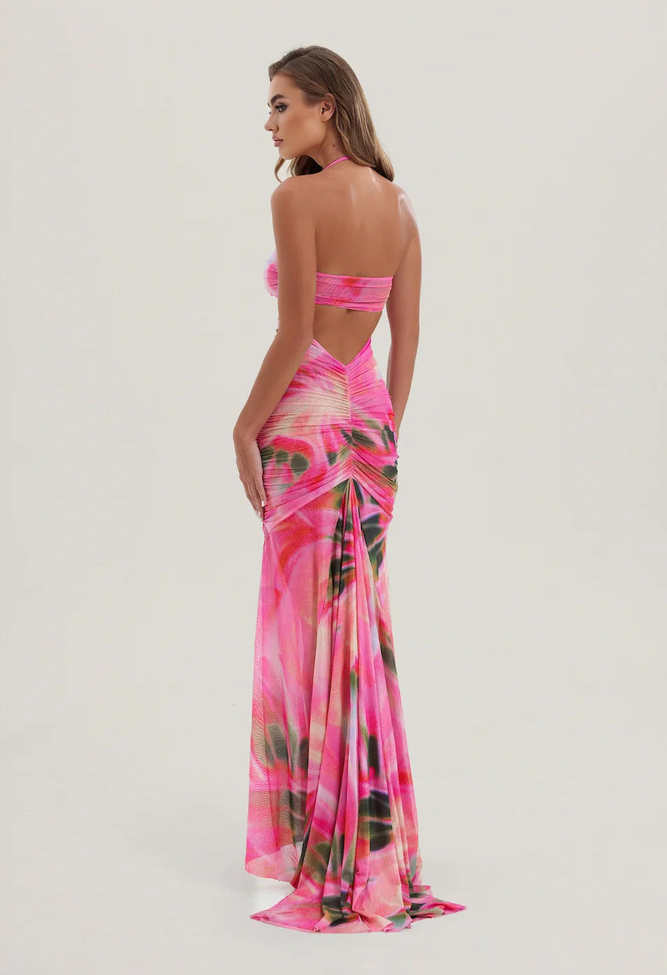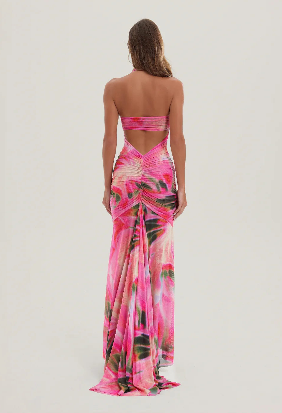 Introducing our viral Bronte Mesh Dress in our new pink abstract Mirage print, the ultimate statement piece of the season. This dress features gathered mesh panels that are designed to beautifully flatter curves and show off your silhouette. With removable padding and removable halterneck straps, you can enjoy added support and coverage when desired or wear as a strapless for less support. A dramatic statement train has been designed to create the most breathtaking movement when walking, making everyone stop and look twice.
