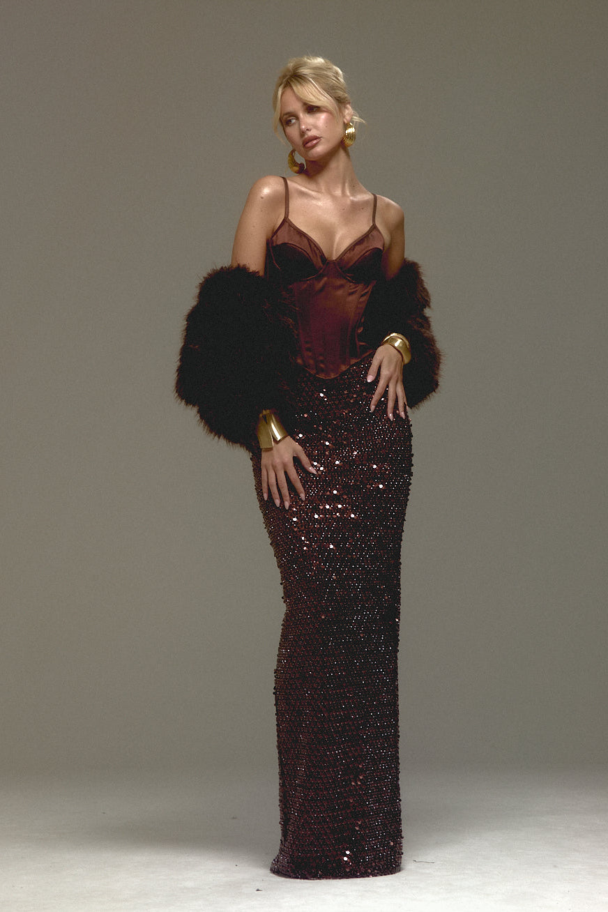 WHERE TO WEAR: Designed for Christmas parties, evening occasions, and New Year’s Eve celebrations, Cheyne in Chocolate Brown adds a warm, refined edge to your festive wardrobe. Style with our Quartz Crystal Maxi Skirt for a sophisticated brown corset outfit that stands out from the crowd this party season.