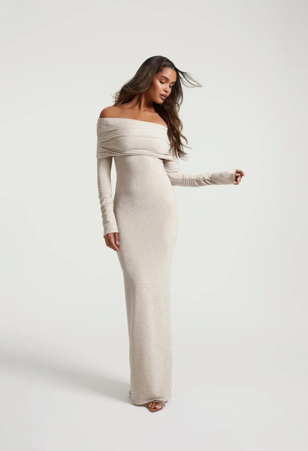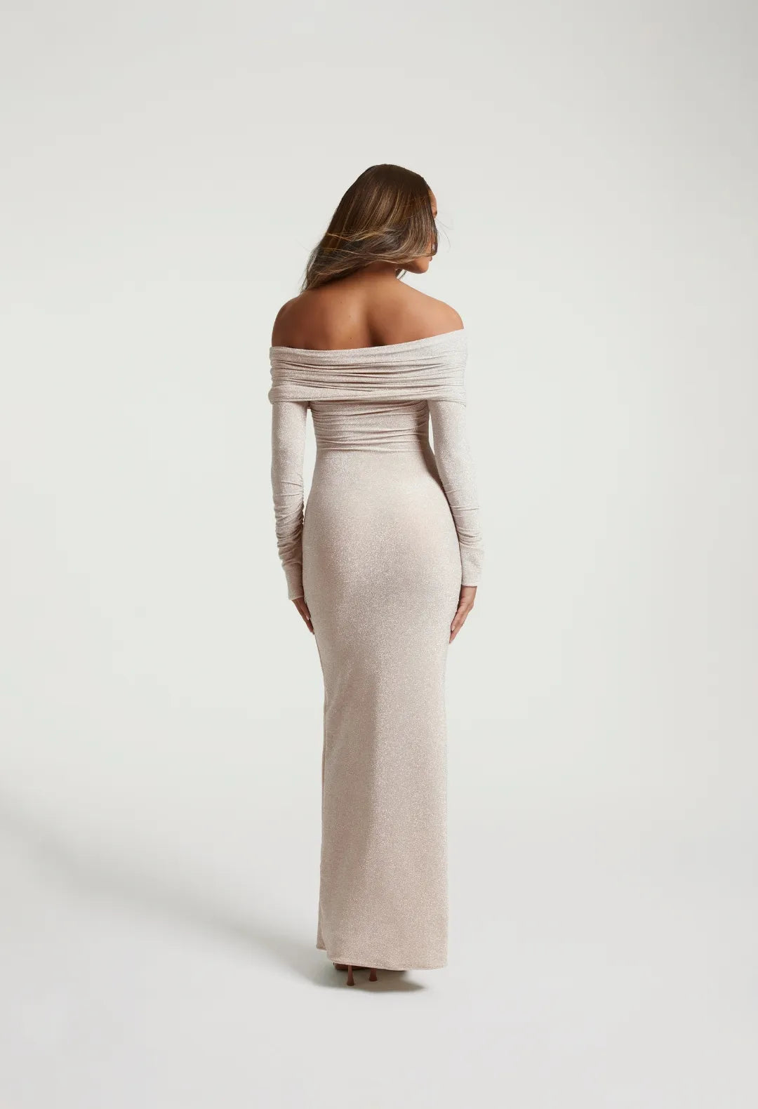 Step into the spotlight this season with our Elsa floor-length strapless dress in Champagne. Woven with the softest silver thread this luxury metallic fabric hugs your silhouette in all the right places and gives off a subtle champagne shimmer whenever the light hits. Pair with your favorite strappy heels and a statement earring for an unforgettable look that will turn heads and leave a lasting impression this party season
