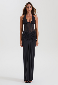 This luxury black corset top features powerful mesh panelling with contouring seam details that shape and snatch in all the right places. A supportive underwire and adjustable halter tie combine to enhance and lift, creating the perfect plunging neckline corset. She went viral for a reason.
