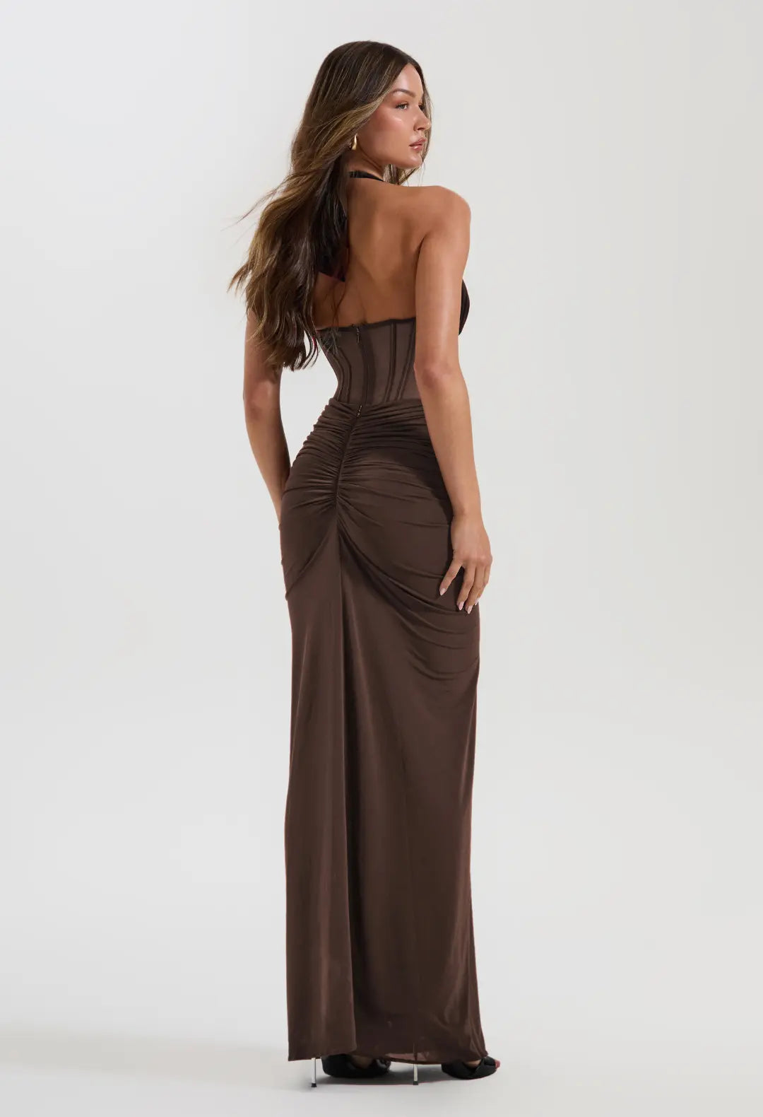 WHERE TO WEAR: A true statement piece for Christmas parties, cocktail evenings, and New Year’s Eve celebrations, this chocolate maxi skirt is the ultimate choice for elevated partywear and eveningwear. Style with the Grace Brown Underwire Corset for a sophisticated brown corseted co-ord set that went viral for a reason.