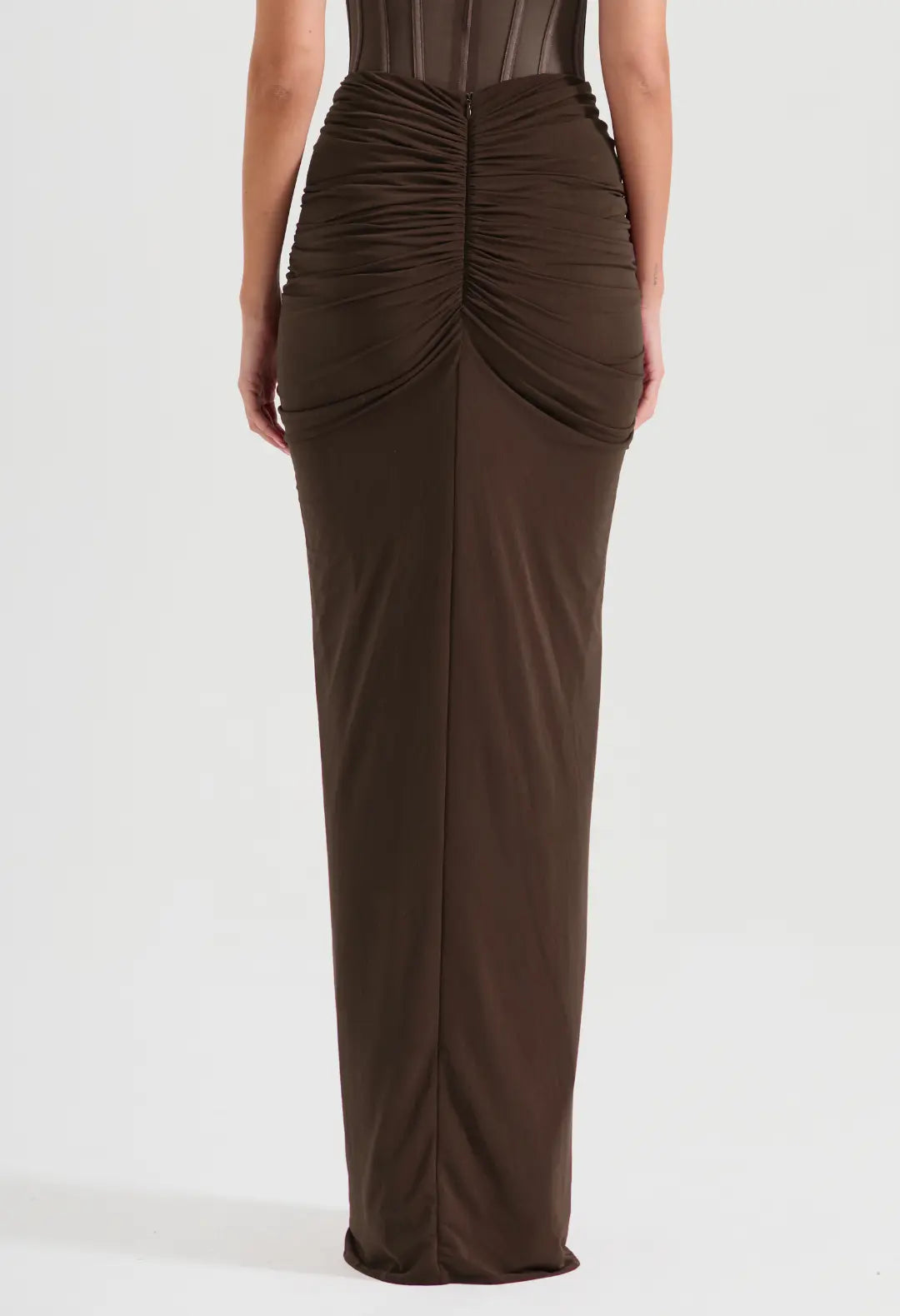 Make an unforgettable entrance in the Grace Maxi Skirt in Brown, our best-selling brown maxi skirt reimagined in a rich, chocolate brown hue. Designed to sculpt, flatter, and elongate, Grace is crafted in our luxurious stretch fabric with a ruched, gathered front that cinches the waist and drapes beautifully to the floor. The figure-skimming cut and gathering enhance every curve, creating an elegant and dramatic shape from every angle.