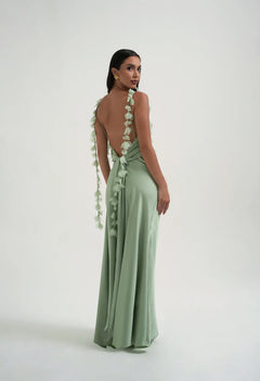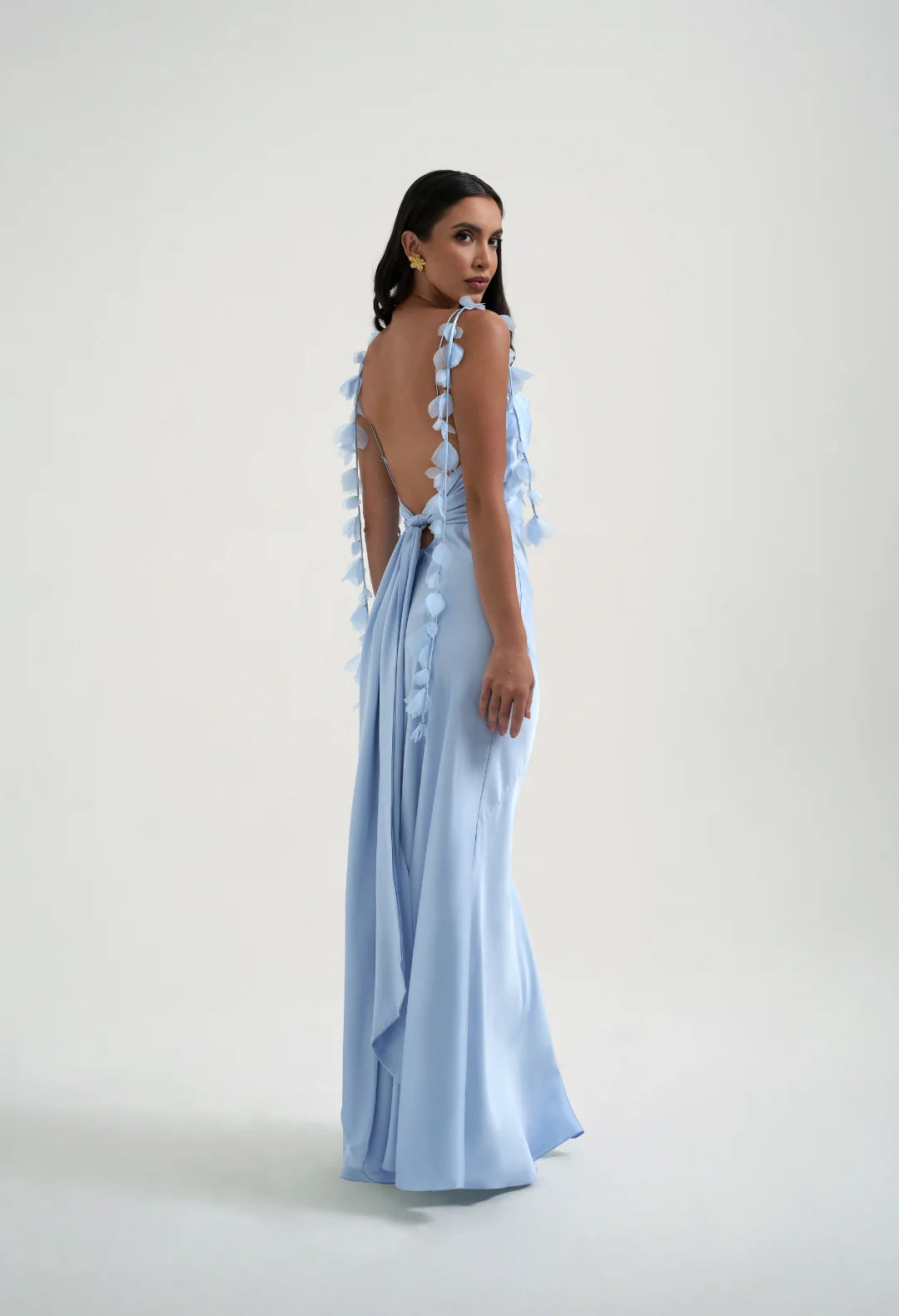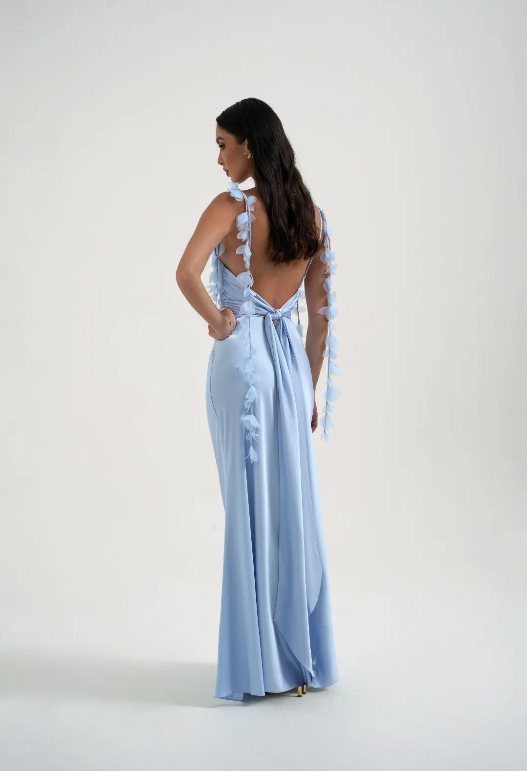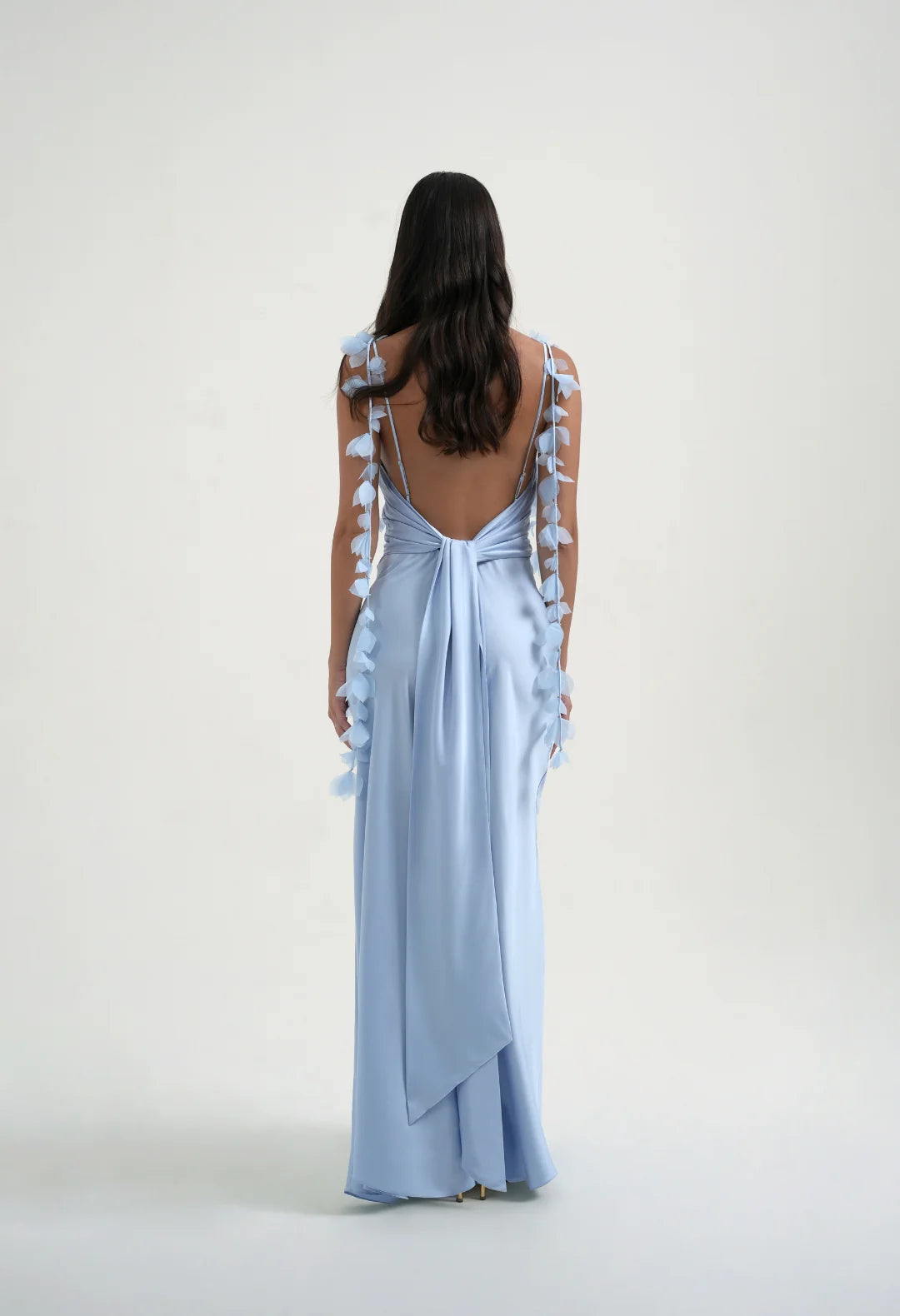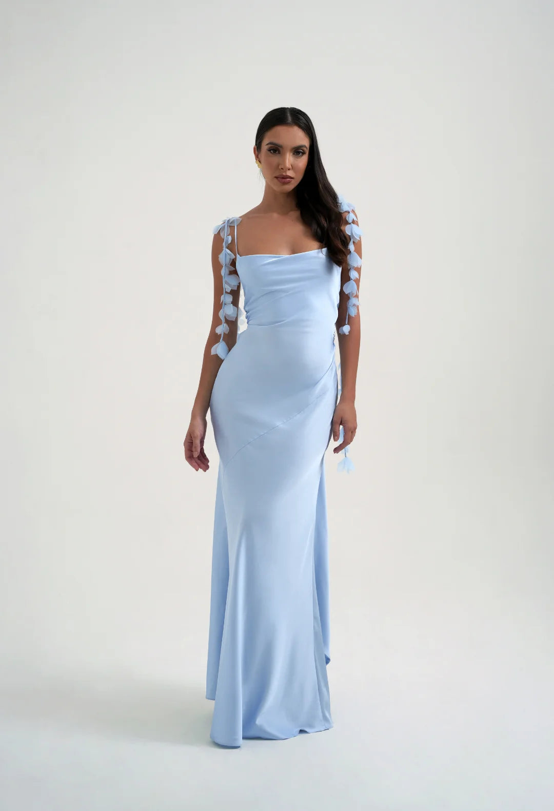 Our best selling Tilly slip dress is back and even better in this beautiful baby blue. A popular style with bridesmaids and wedding guests, Tilly is the epitome of delicate luxury for any special occasion. A silky draped cowl neck and bias cut body flows when worn and creates the most mesmerising movement. Adorned with hand-sewn organza flower straps with added adjustment at the back this style suits every body shape. Tilly features a striking low back and statement tie at the waist to provide added shape and support. Don’t forget to experiment with crossing the ties at the front, and styling around the neck, for a unique halter look.