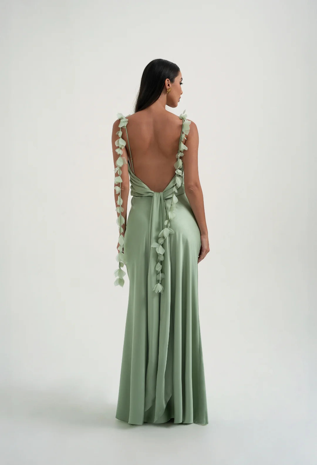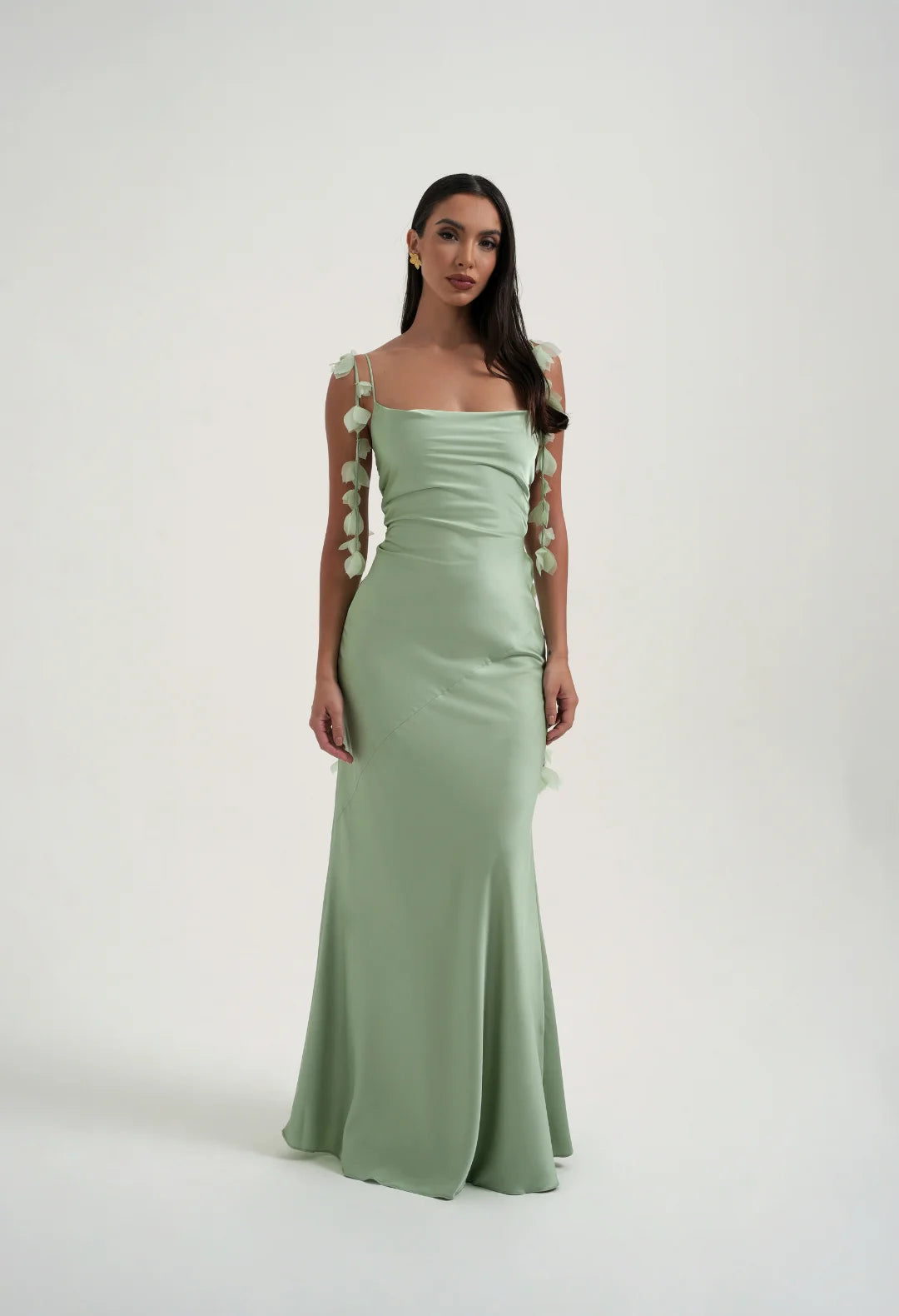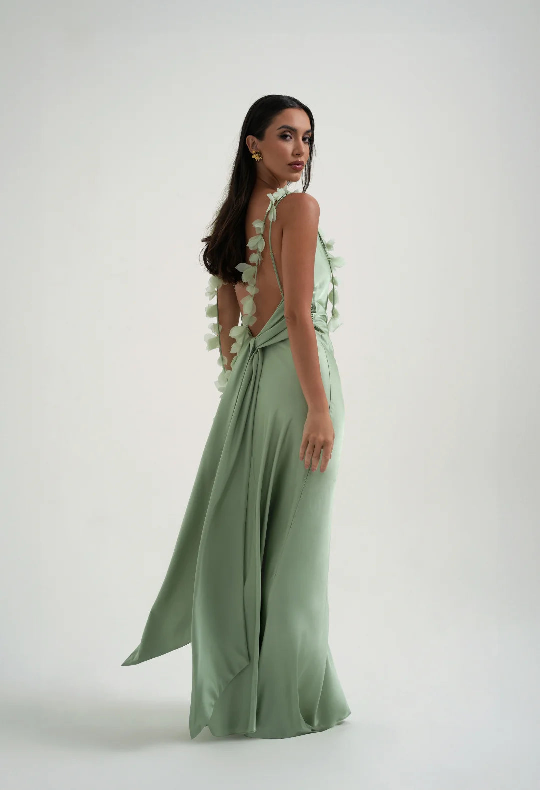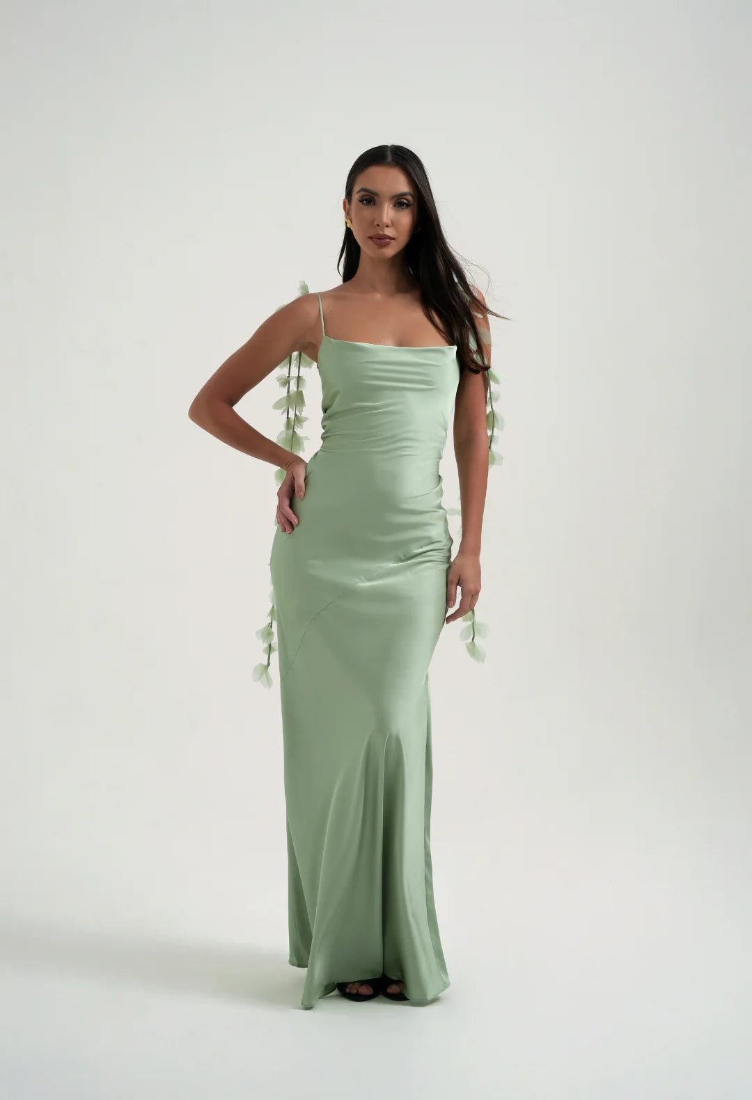Our best selling Tilly slip dress is back and even better in this beautiful sage green. A popular style with bridesmaids and wedding guests, Tilly is the epitome of delicate luxury for any special occasion. A silky draped cowl neck and bias cut body flows when worn and creates the most mesmerising movement. Adorned with hand-sewn organza flower straps with added adjustment at the back this style suits every body shape. Tilly features a striking low back and statement tie at the waist to provide added shape and support. Don’t forget to experiment with crossing the ties at the front, and styling around the neck, for a unique halter look.
