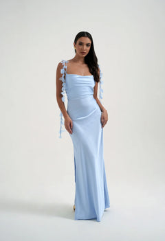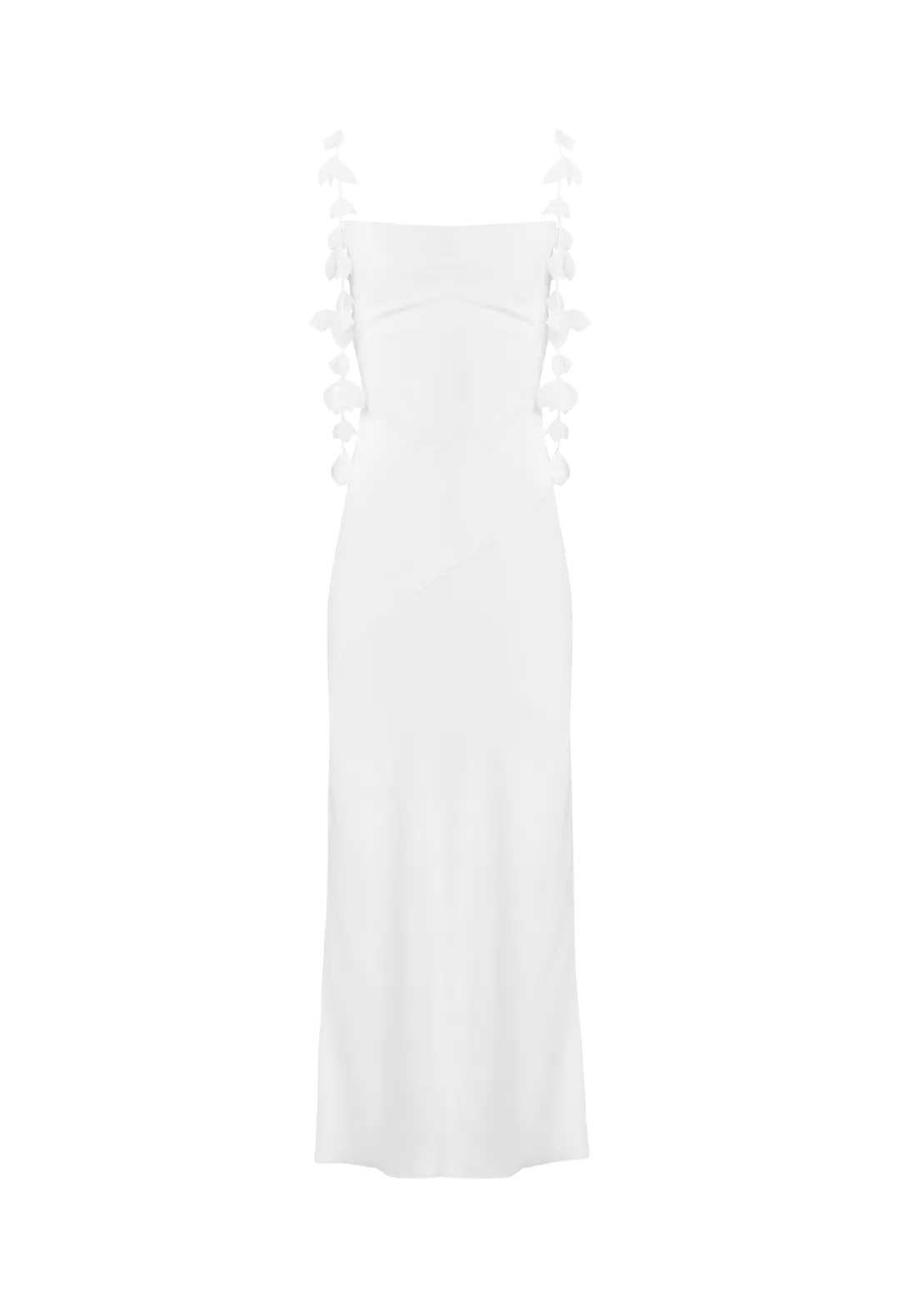 Perfect for our Sydney Lane brides, the Tilly Slip Dress in white is the it-girl choice for a summer wedding, hen do, or any destination white party this season. A silky draped cowl neck and bias cut, floor length body flows over the skin when worn and creates the most mesmerising movement. For added drama, a small train at the back is designed to melt behind you as you walk like liquid silk. Adorned with hand-sewn organza flower straps that can be styled in multiple ways, this dress features a striking low back and statement tie at the waist to provide added shape. For a distinctive touch, experiment with crossing the ties at the front and styling around the neck for a unique halter look.
